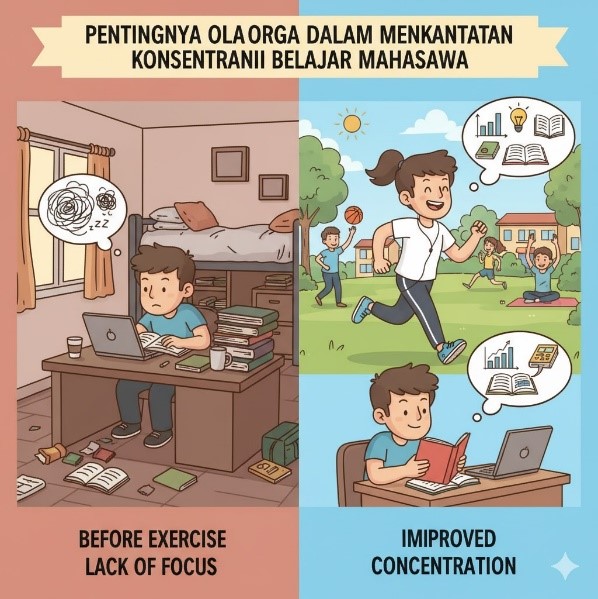 Olahraga memiliki peran penting dalam menunjang keberhasilan akademik mahasiswa. Aktivitas fisik terbukti mampu meningkatkan aliran darah ke otak, sehingga memperbaiki konsentrasi, daya ingat, serta kemampuan berpikir kritis. Menurut penelitian